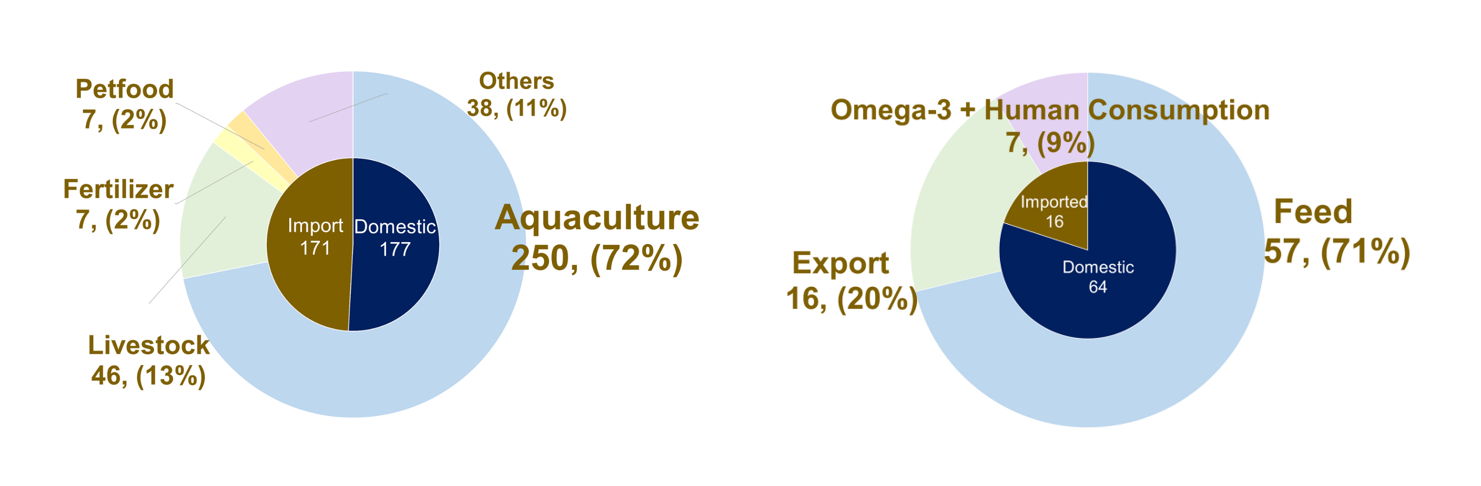For fish oil, Japan maintains high domestic production, with feed representing 71% of total usage, followed by human consumption (omega-3) at 9%. Chile dominates imports (75%), particularly salmon oil that meets Japan’s certification requirements. In addition, Japanese sardine oil production is increasing, both in volume and market value.