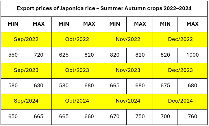 The below table demonstrates the Japonica SA price from 2022 to 2024 with: