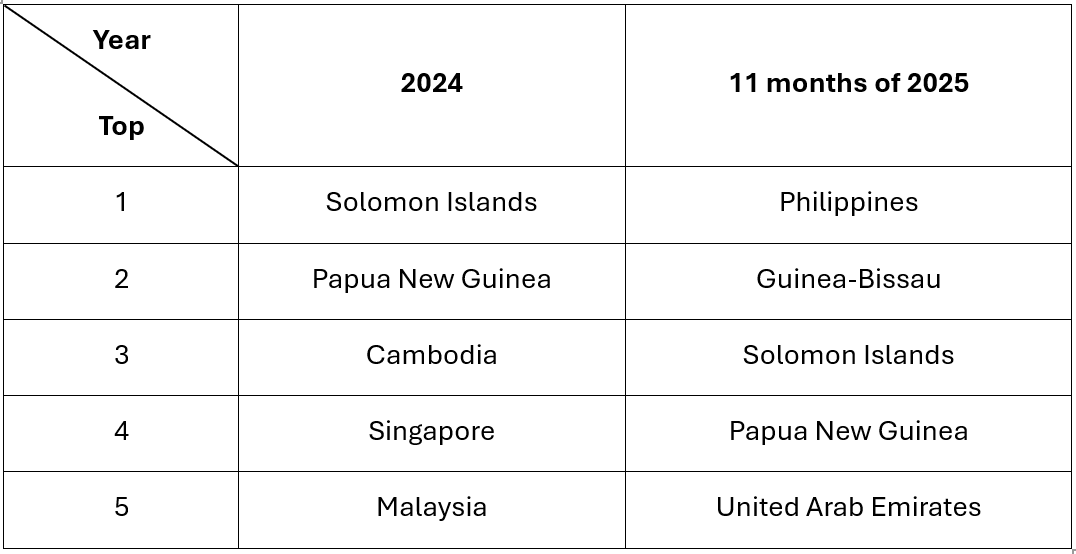 By contrast, in 2025, the Philippines became the largest destination, reflecting stronger demand from major importing countries. The appearance of new markets such as Guinea-Bissau and the United Arab Emirates also indicates increasing market diversification. Overall, this trend suggests expanding demand and greater potential for market development in the future.