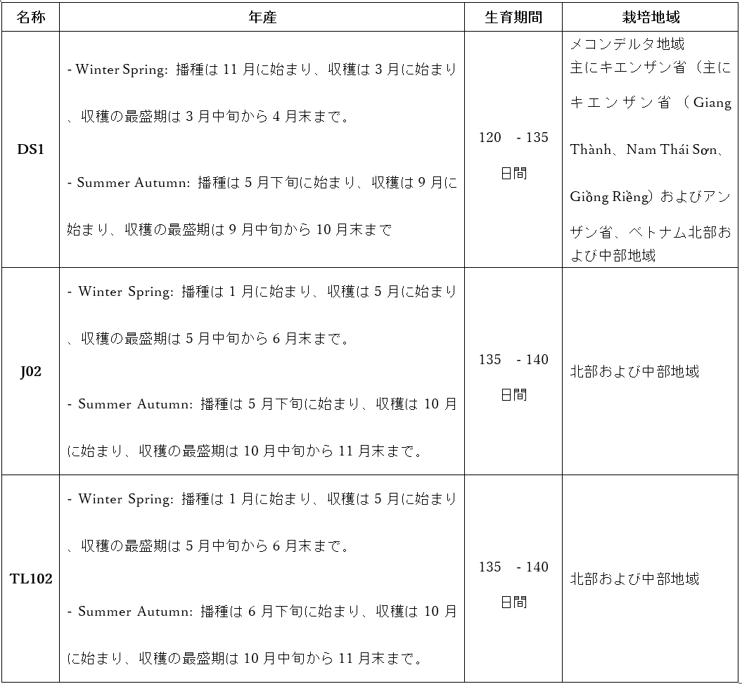 ベトナムで使用されている元々のジャポニカ米の種子はオーストラリア由来である。オーストラリアにおけるジャポニカ米の主な栽培地域はニューサウスウェールズ州で、同地域の土壌は比較的塩分濃度が高い。キエンザン省およびアンザン省の土壌特性はオーストラリアと非常によく似ている。そのため、この地域がベトナムにおけるジャポニカ米の最大の生産量を占めている。また、塩分濃度は 6〜7 月にピークを迎えるため、夏秋作のジャポニカ米は品質が最も良い。外観は冬春作より光沢があり、粒も大きい。