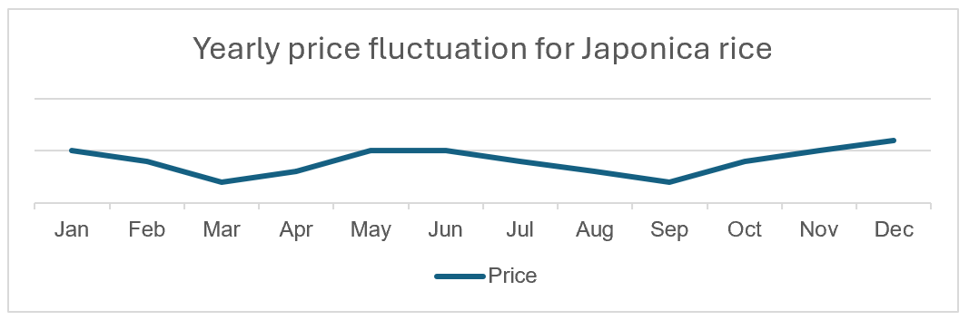 ジャポニカ米の価格は収穫期の初めに下落する傾向があり、収穫ピークで最も大きく下がる。特に冬春作は 4 月、夏秋作は 9 月に価格下落が顕著。その後、価格は回復する。通常 10〜12 月に急騰し、翌年 2 月まで高い水準を維持し、4 月頃の新作期に向け再び緩やかに下落する。