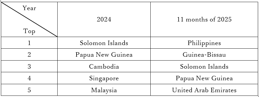 特に輸出市場については、2024 年と 2025 年 11 ヶ月時点で明確な変化が見られる。2024 年はソロモン諸島、パプアニューギニア、カンボジア向けが中心であった。一方、2025 年にはフィリピンが最大の輸出先となり、主要輸入国からの需要拡大が示唆される。さらにギニアビサウやアラブ首長国連邦といった新市場も登場し、市場多様化が進展している。