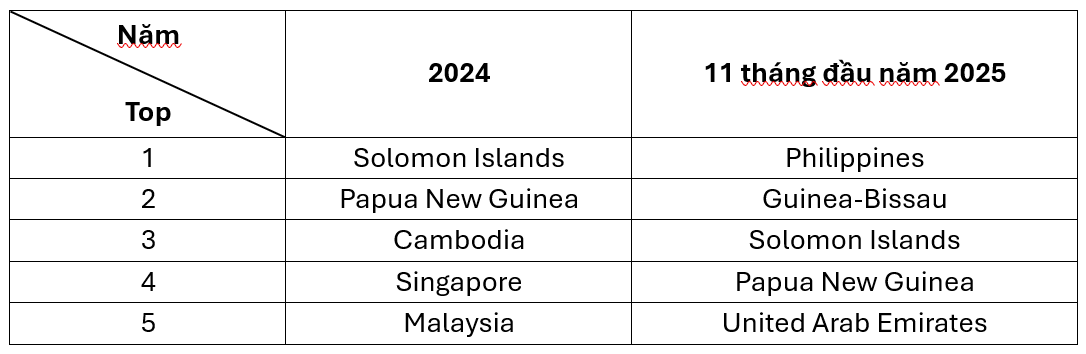 Sang năm 2025, Philippines vươn lên trở thành thị trường nhập khẩu lớn nhất, phản ánh nhu cầu gia tăng từ các quốc gia nhập khẩu quy mô lớn. Đồng thời, sự xuất hiện của các thị trường mới như Guinea-Bissau và Các Tiểu vương quốc Ả Rập Thống nhất cho thấy xu hướng đa dạng hóa thị trường ngày càng rõ nét.